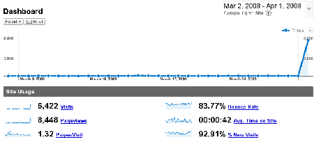 Now, I have been pretty happy with this. For the month of March, I was enjoying upwards of 30 uniques per day, with 2 pages per visit. Then the April Fools post was stumbled, dugg, sphunn, tweeted, etc, and this happened: