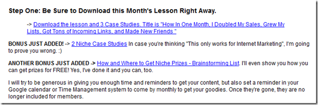 Note that this first month consists of a monthly lesson. This month the lesson includes 3 case studies. She has also added two bonuses already this month as you can see (additional case studies and a brainstorming list). Pretty cool.